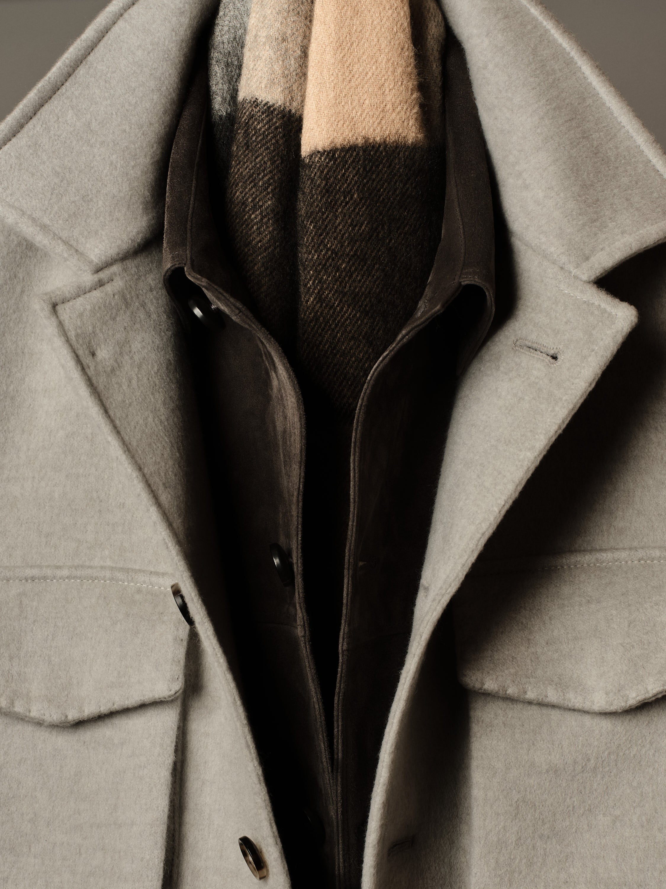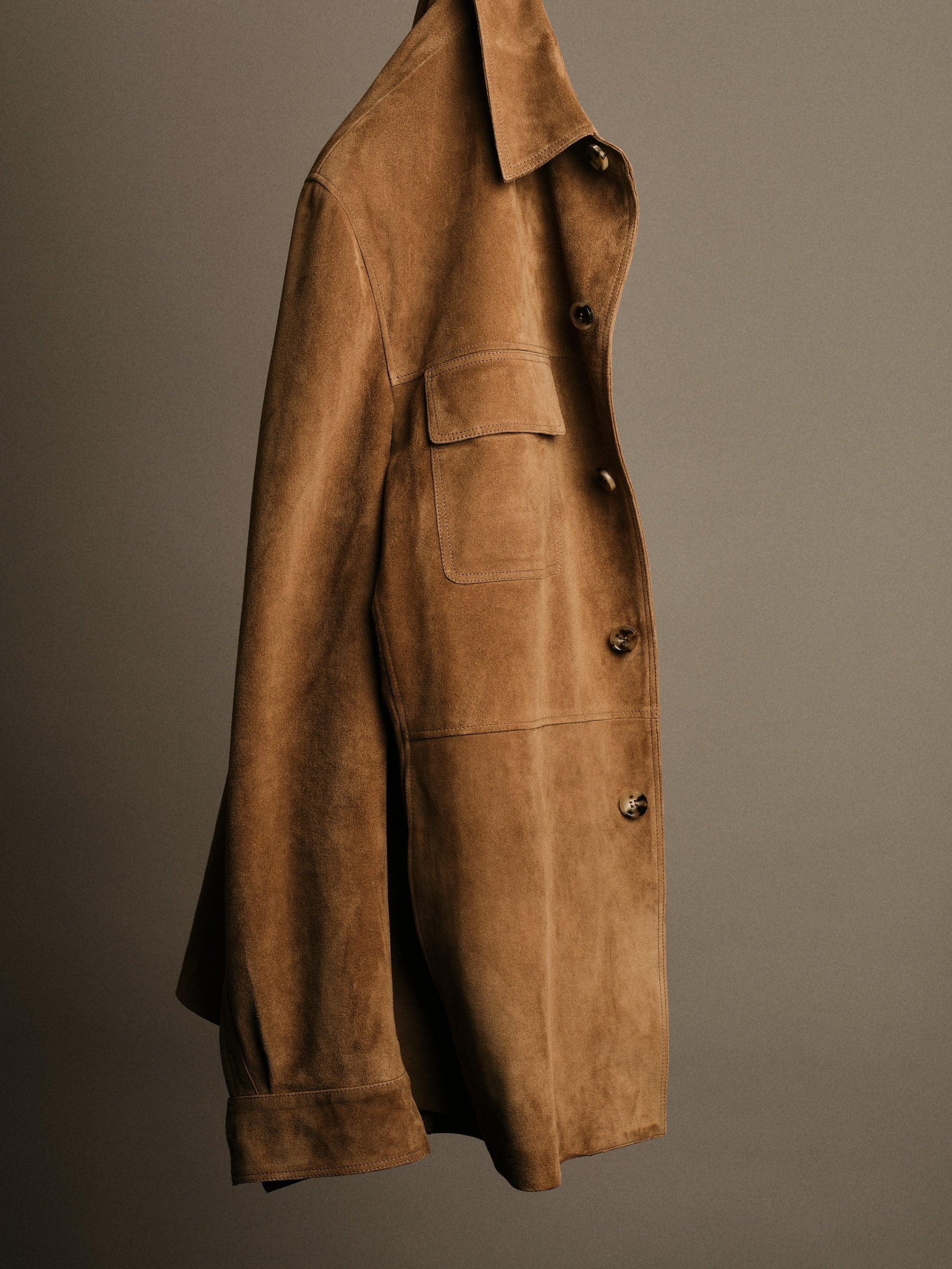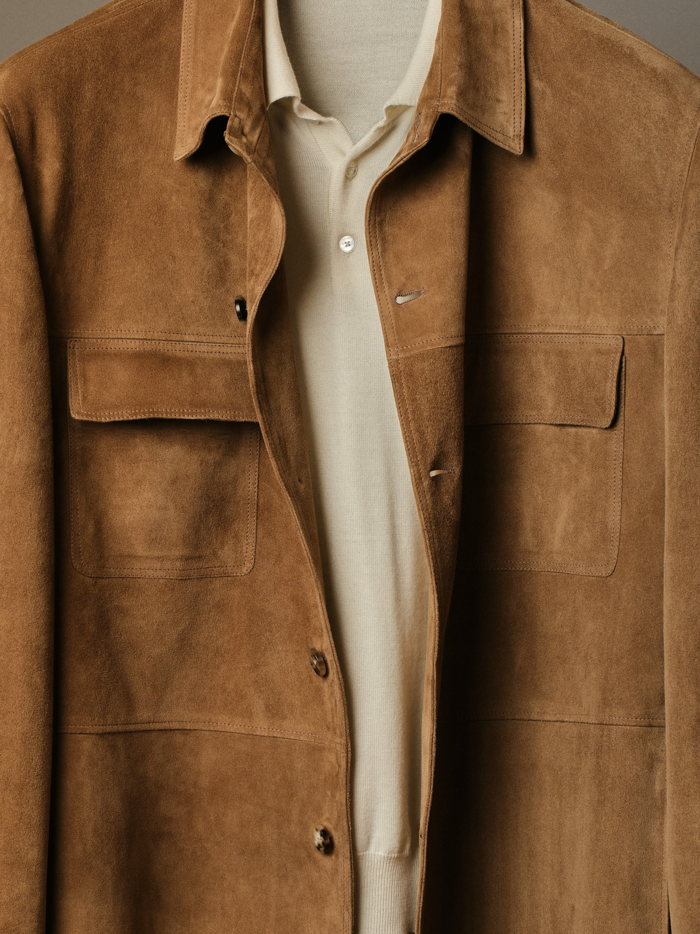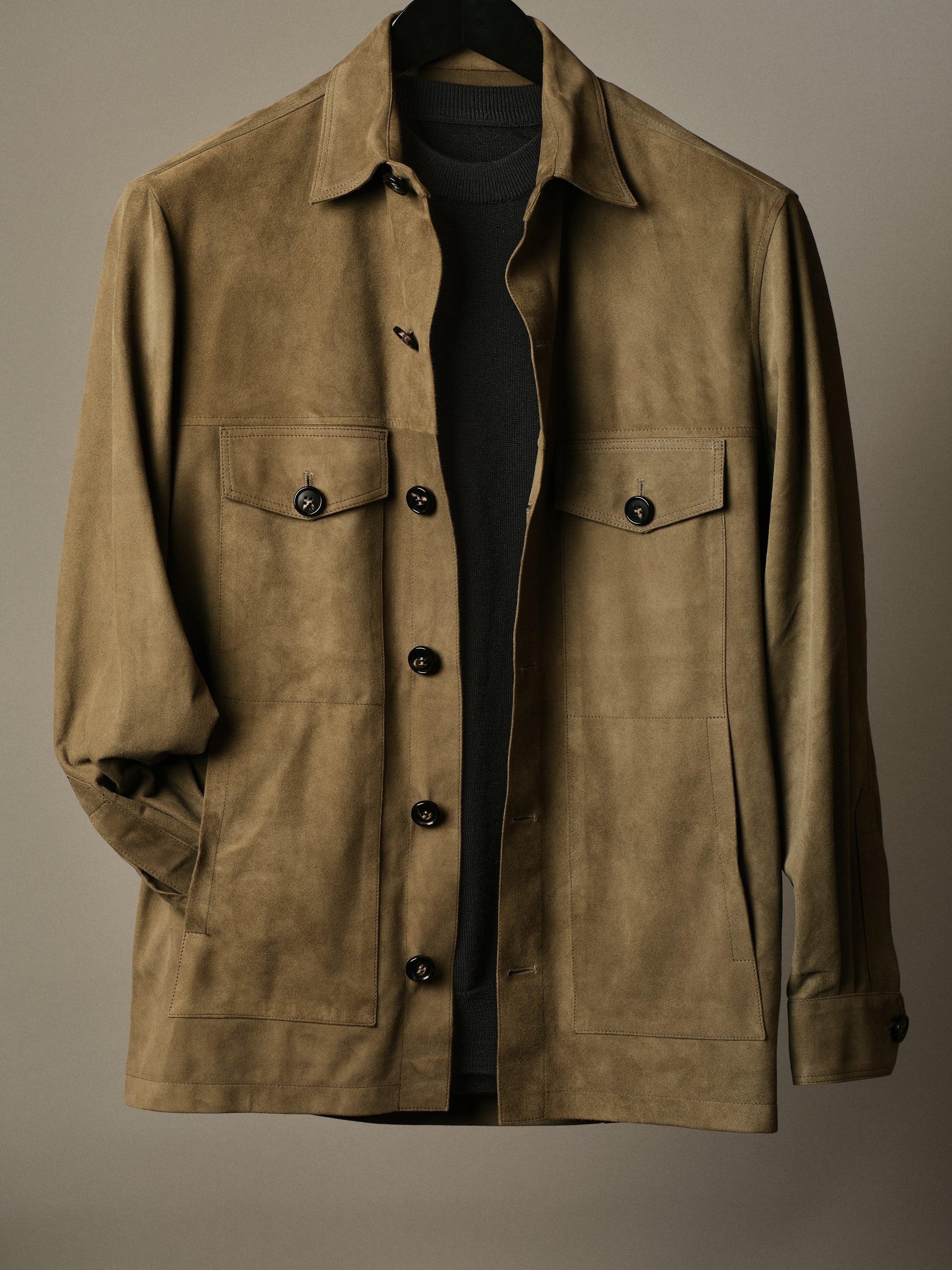Offered in timeless styles including bombers, field jackets, and overshirts, each piece is cut from a considered selection of suede, leather, or cashmere, and tailored to your measurements and personal style.